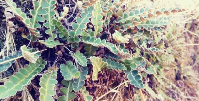 Otra planta que crece en las rocas y cuya evolución se ha detenido en el tiempo es la hierba dorada (Ceterach officinarum). Cuando digo que es una planta antigua, me refiero a que se trata de un helecho y como bien sabes son de las especies vegetales mas primitivas que pueblan la tierra.