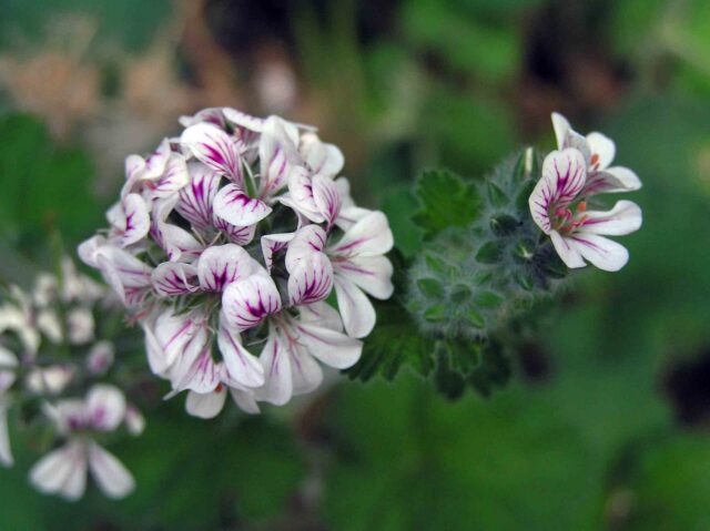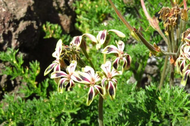 Como hemos comentado, la historia del género Pelargonium como planta ornamental comienza con este geranio. Conocido como geranio de aroma nocturno, los pétalos de las flores poseen marcas de color marrón que pueden ser estrechas u ocupar el pétalo dejando un margen blanco.
