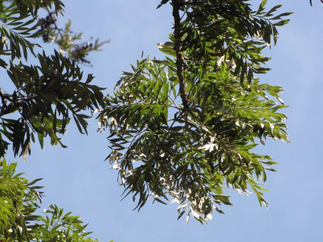 Volviendo a la luz, son destacables las hojas bipinnadas semejantes a las frondas de los helechos. Los enveses de estas hojas son de color grisáceo y de ahí que posee el sobre nombre ‘plateado’.