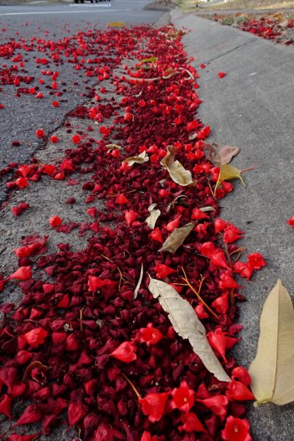 Durante estas semanas, la copa del árbol se cubre de una espesura de pequeñas flores con forma de campana. Las flores son, por supuesto, las que portan el llamativo color escarlata, concretamente, los cinco pétalos parcialmente unidos en la base que se van abriendo y curvando para ir terminado en punta. Los pedúnculos que unen las flores a las ramas también contribuyen a dar ese aspecto de árbol de color rojo.