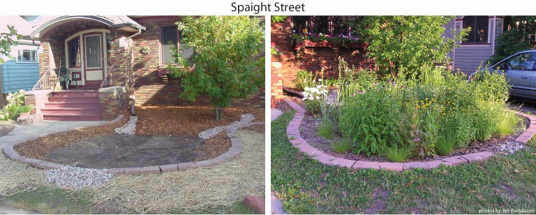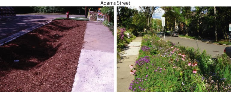 | Antes y después de un jardín de lluvia en Adams Street en Madison |