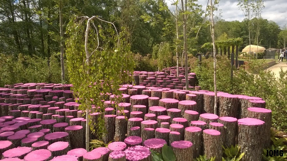 una baja y dinámica formada por troncos pintados en rosa, otra alta y viva