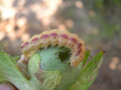 | Larva de Helicoverpa armigera devorando una cápsula de algodón. |