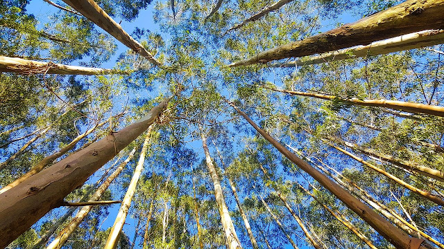 Paradigma a parte, los eucaliptos poseen cierta majestuosidad cuando los encuentras en parques públicos. Su elevado tamaño que alcanza los sesenta metros de altura y su porte en forma de columna, crea la sensación al adentrarte en un bosque de eucaliptos de estar recorriendo una enorme bóveda peristilada de color verde y muy natural.