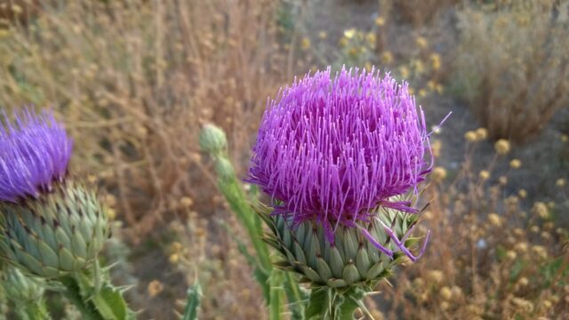 Curiosamente, al cardo se le considera una planta fea e, incluso, se utiliza como adjetivo en este mismo sentido. Sin embargo, a mi me parece que es una de las flores espontáneas más hermosas que nos regala la primavera. Además, tiene el mérito de haberse convertido en la flor nacional de Escocia y simplemente por evitar una incursión vikinga una noche de hace muchos años. Los saqueadores se introdujeron en terreno escocés y al ser pinchados por las espinas que envuelve al cardo en tallo, hojas y bráctea de la flor, no pudieron reprimir los gritos que alertaron a los escoceses y tuvieron tiempo de reaccionar rechazando el ataque. Y fue así, en aquella épica noche, como comenzó a fraguarse la historia de la flor que se convertiría en el símbolo nacional.