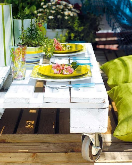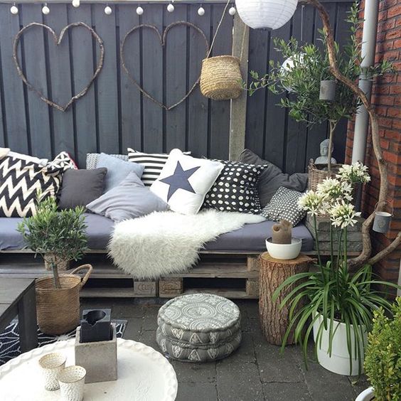 Si cuentas con un poco más de espacio, aparte de tener un lugar común con las sillas y la mesa, puedes disponer de un rincón de relax o lectura. Aprovecha una de las esquinas para colocar estructuras de palés que recubrirás con cómodos colchones y cojines a medida.