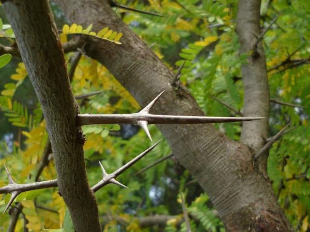 La Gleditsia triacanthos es un árbol empleado en alcorques y parques que tiene grupos de tres espinas de varios centímetros de longitud por toda su arquitectura arbórea de tronco y ramas.