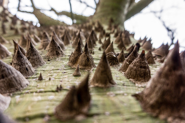 A Ceiba speciosa le ocurre igual que a la gleditsia, es un árbol con corteza muy abrupta y con elementos punzantes que son casi como pequeños cuernos.
