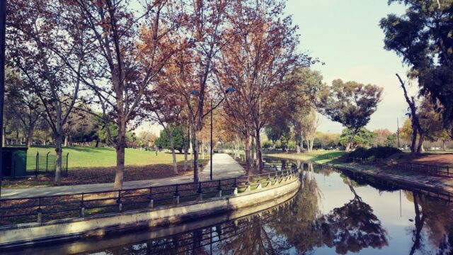 Para alimentar el lago hubo que crear un arroyo artificial que bebe del antiguo cauce del Tagarete y que ha creado una de las estampas con más valor ornamental que llevo vistas este otoño. Se trata de un paseo alfombrado con las hojas pardas de los plátanos de sombra y que crea un marco único al canal, el cual refleja en la lámina de agua cielo, nubes y arbolado. Siguiendo este camino llegamos hasta el puente de la alcantarilla que conforma, junto a otros restos, un vestigio histórico de construcciones pasadas que nos dan una idea de como era el entorno del arroyo Tagarete antiguamente.