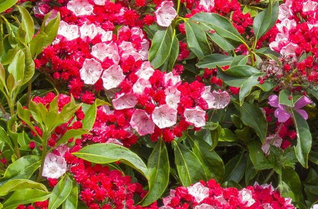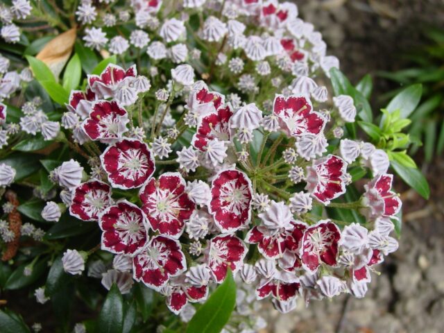 Tampoco podemos dejar de mencionar a Kalmia latifolia, una especie muy apreciada en jardinería y que posee una gran cantidad de cultivares con flores de atractivos colores y que se agrupan en el arbusto cayendo en un abundante racimo.
