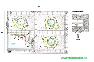 En el que se encuentra en el margen inferior izquierdo, junto a la piscina del inmueble, posee dos jardineras semicirculares elevadas pegadas a la escalera de acceso, en las que se ha proyectado la plantación de Zantedeschia eathiopica (Cala, nº7). La distribución de la piscina y la pasarela ha tenido como resultado la formación de dos parterres triangulares en las que se recomienda la plantación de una masa de Lavandula angustifolia (Lavanda, nº6), por la zona central y de una bordura de Chlorophytum spp. (Cintas, nº8) para la separación con la pasarela de acceso.