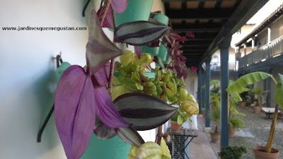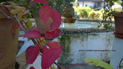 blanco. Sobre este borde hay macetas de barro con Bignonias, Cintas, Crassula,