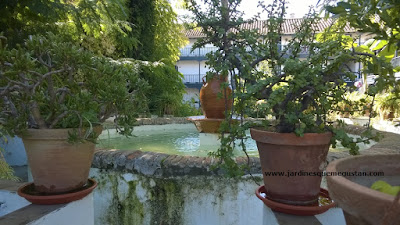 | Parte trasera de la fuente con las cuatro buganvillas en maceta |