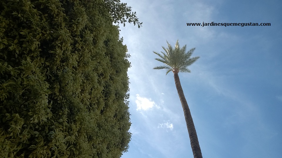 vista y pared pintada de blanco, en el que crece una enorme palmera Phoenix que ha sido convenientemente